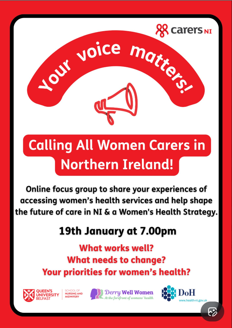 Carers NI are hosting an online focus group to enable women carers to share their experiences of accessing women's health services. Their input will shape the future of care in NI and a Women's Health Strategy.