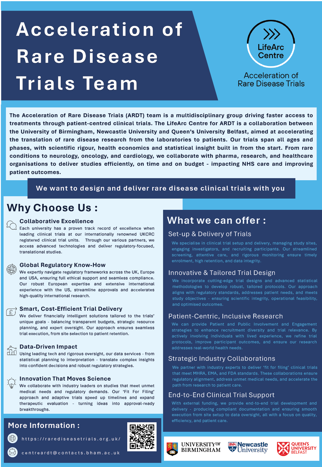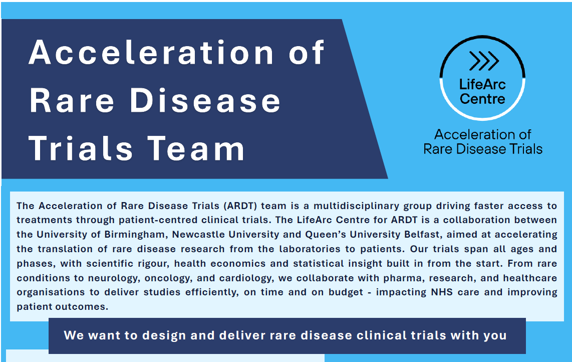Our UK-wide LifeArc Centre for the Acceleration of Rare Disease Trials is now open and welcoming proposals for clinical trials focused on evaluating treatments for patients with rare diseases - flyer below. Our LifeArc Centre offers comprehensive support across all stages of the rare disease trial lifecycle—from trial design and funding applications to trial management, supporting recruitment, delivery, reporting, and dissemination of results.