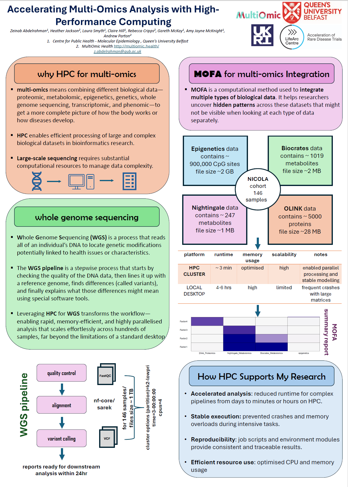 She showcased how NI-HPC dramatically reduces analysis time for large-scale datasets—from days to minutes—while ensuring stability and reproducibility across complex workflows. Her work demonstrates that by leveraging high-performance computing, we can efficiently process and integrate multiple layers of biological data, including proteomics, metabolomics, epigenetics, and whole-genome sequencing. This integration is critical for uncovering hidden biological patterns that would otherwise remain undetected when analysing each data type in isolation.