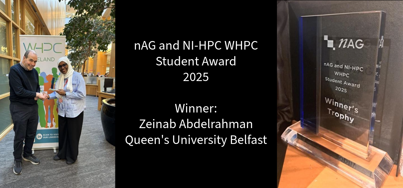 The nAG and NI-HPC WHPC Student Award, a collaboration between the nAG Women in Tech and WHPC Chapter Groups and NI-HPC’s WHPC Chapter, joined nAG’s prestigious Student Awards programme to recognise outstanding achievements by female students in HPC. This award highlights exceptional contributions from students at NI-HPC, representing Queen’s University Belfast and Ulster University, striving to inspire a more inclusive and diverse future in high-performance computing.
