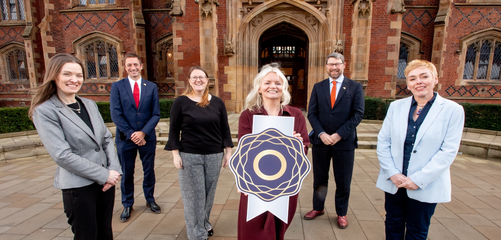 Pictured with the award are (l-r): Professor Karen McCloskey, Director of Queen’s Gender Initiative; Conor Curran, Head of Diversity and Inclusion, Queen’s University Belfast; Joanne Clague, Registrar and Chief Operating Officer, Queen’s University Belfast; Nuala Murphy, Interim Head of Business, Diversity Mark NI; Alistair Finlay, Interim Director of Human Resources, Queen’s University Belfast; and Professor Margaret Topping, Pro-Vice-Chancellor for Internationalisation, Queen’s University Belfast.