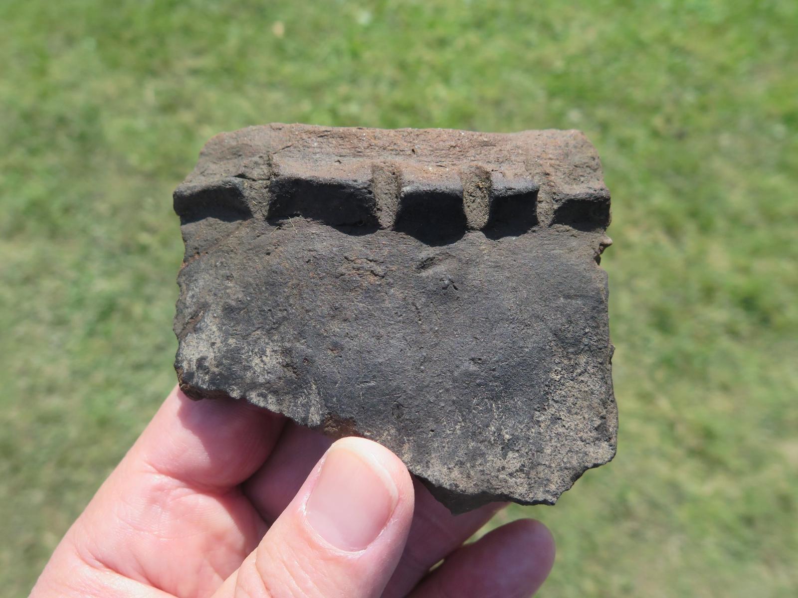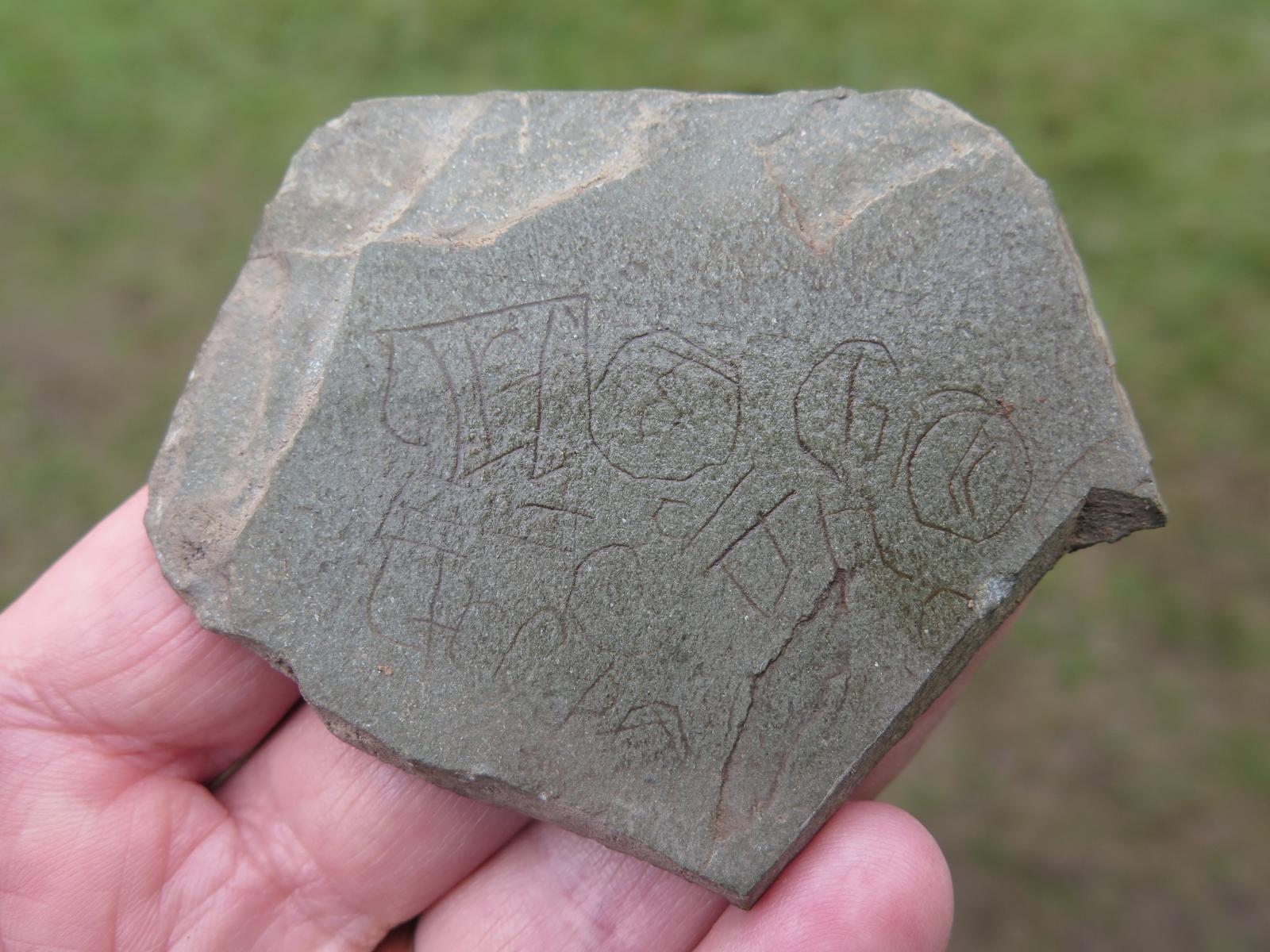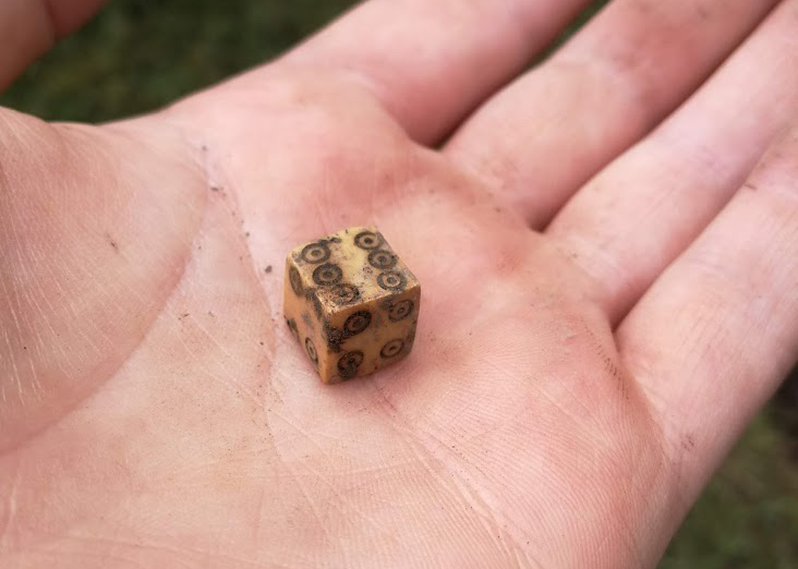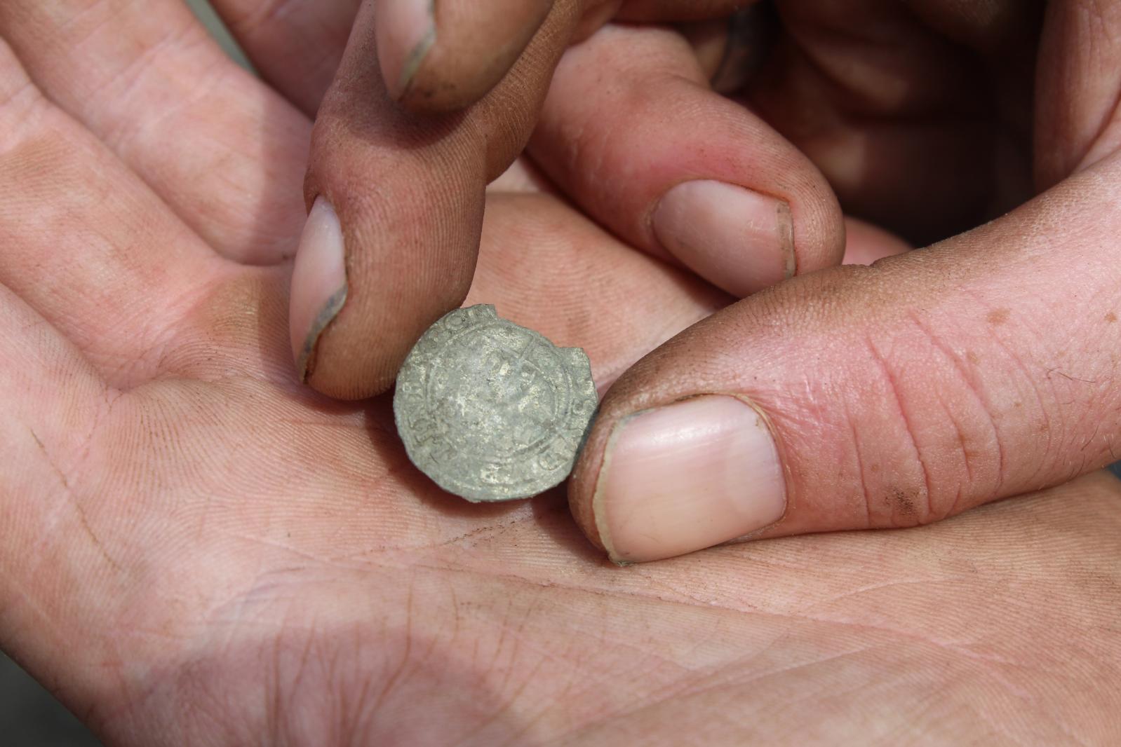 The 2019 excavations further explored the midden area (Trench 1) and investigated two new trenches (Trench 3 and Trench 4). Trench 1 revealed a second midden pit, both midden pits contained metalwork, animal bone and medieval pottery.  Another pit with in-situ burning was also excavated and contained a fragment of an early medieval cross-slab. Trench 3 to the north of the midden area uncovered a possible pre-historc ditch cut by a later pit which contained a medieval knife blade and a slate trial piece. Other finds from the upper levels of this trench included a medieval bone dice, copper slag and an Anglo-Norman arrowhead. Trench 4 uncovered a large circular pit, possibly a well which contained a large fragment of a medieval reliquary.