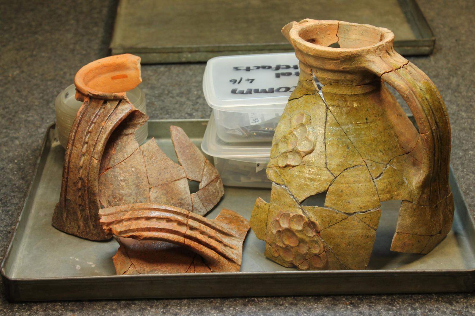 The 2018 excavation investigated this area close to the entrance further. Two trenches were opened. Trench 1 revealed a sloped section of masonry and a large pit containing copious amounts of medieval artefacts. Trench 2, located close by uncovered further masonry which probably represented a robbed out wall associated with the Abbey. The artefacts from these trenches indicated the archaeological remains of a thriving monastic community at Cathedral Hill during the medieval period. The animal remains and ceramics confirmed that the features investigated in Trench 1 during the 2018 excavation were midden pits related to the kitchen of the Benedictine Abbey, complementing the interpretation offered during a Time Team excavation in 1997. Due to time and space constraints it was not possible to excavate to the base of the midden pit however environmental samples confirmed that the lowest deposit encountered was 13th/14th Century in date, with some 8th-10th century material surviving which represents residual activity associated with an earlier monastic establishment.
