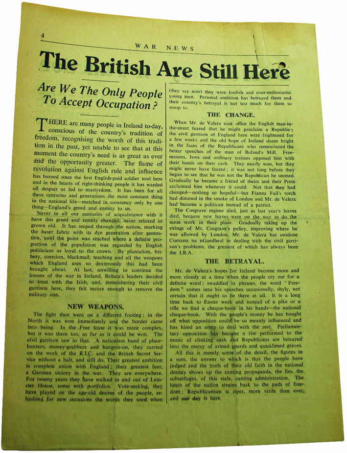 Although some republicans have argued that the IRA’s support for Germany was purely tactical rather than ideological, Document 4 (an extract from the IRA’s propaganda sheet which describes de Valera as a friend of the Jews, Freemasons and traitors) demonstrates the anti-Semitic nature of wartime IRA propaganda.