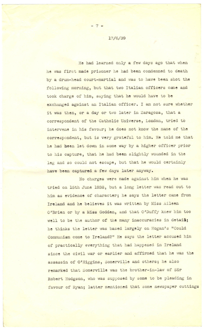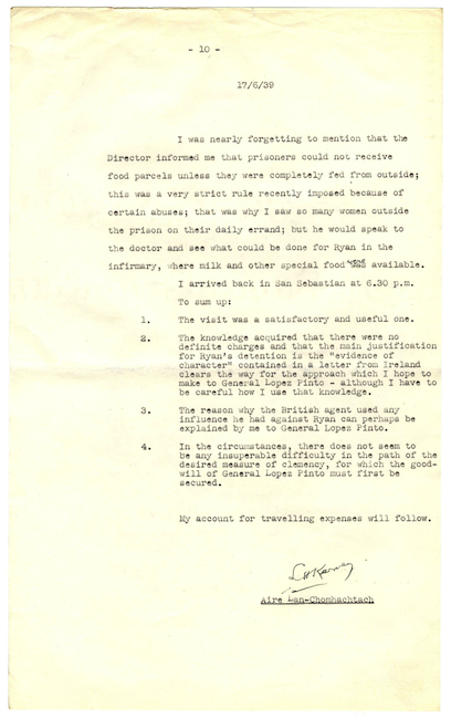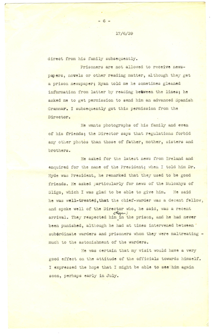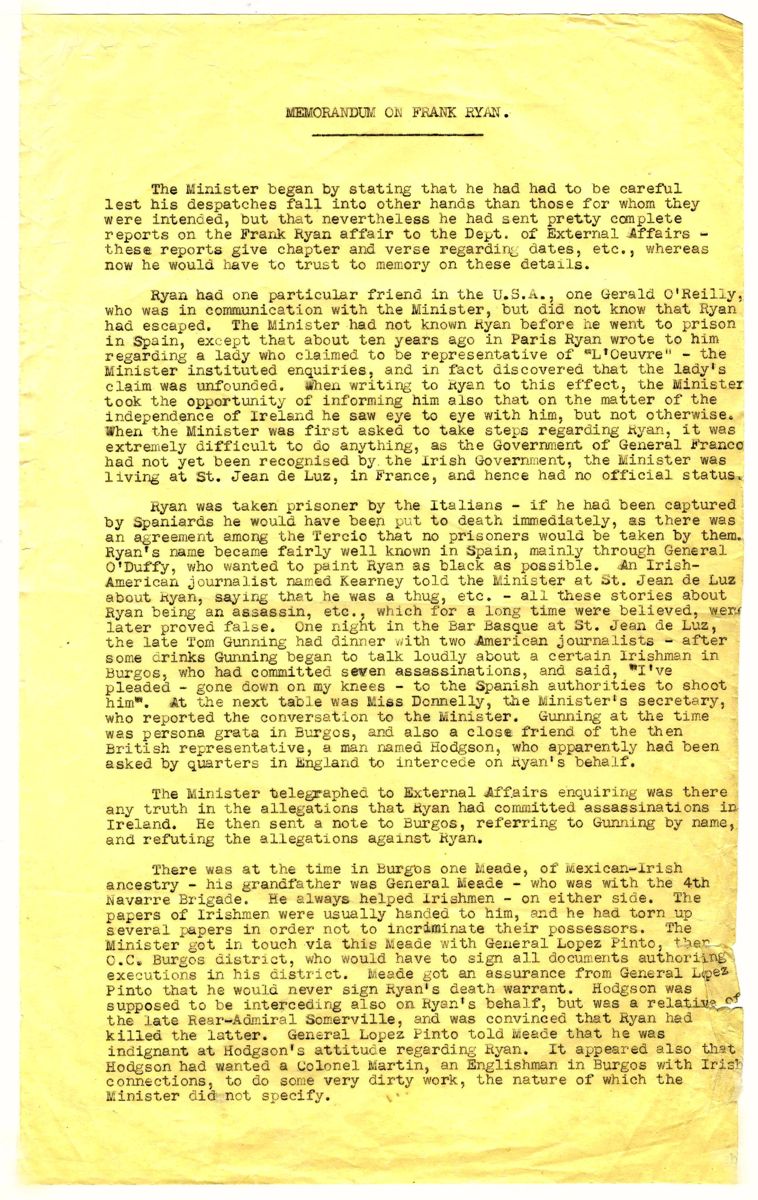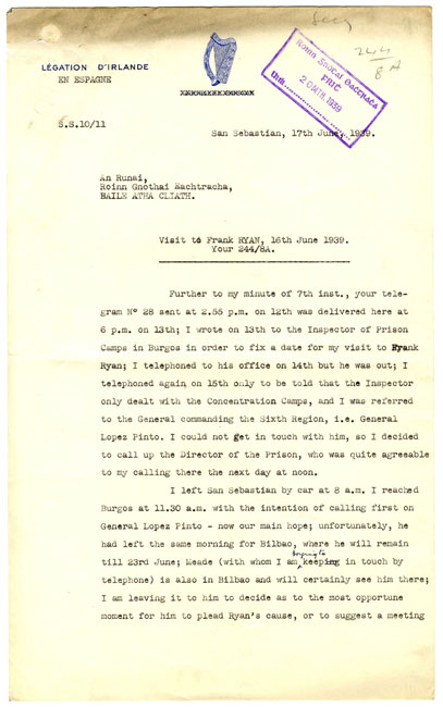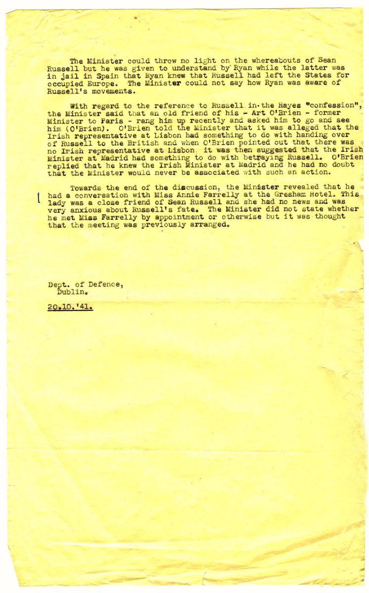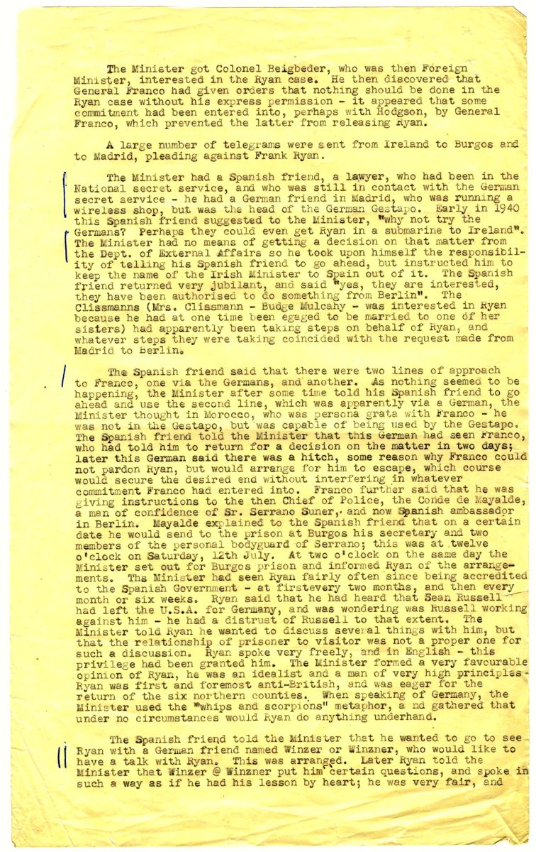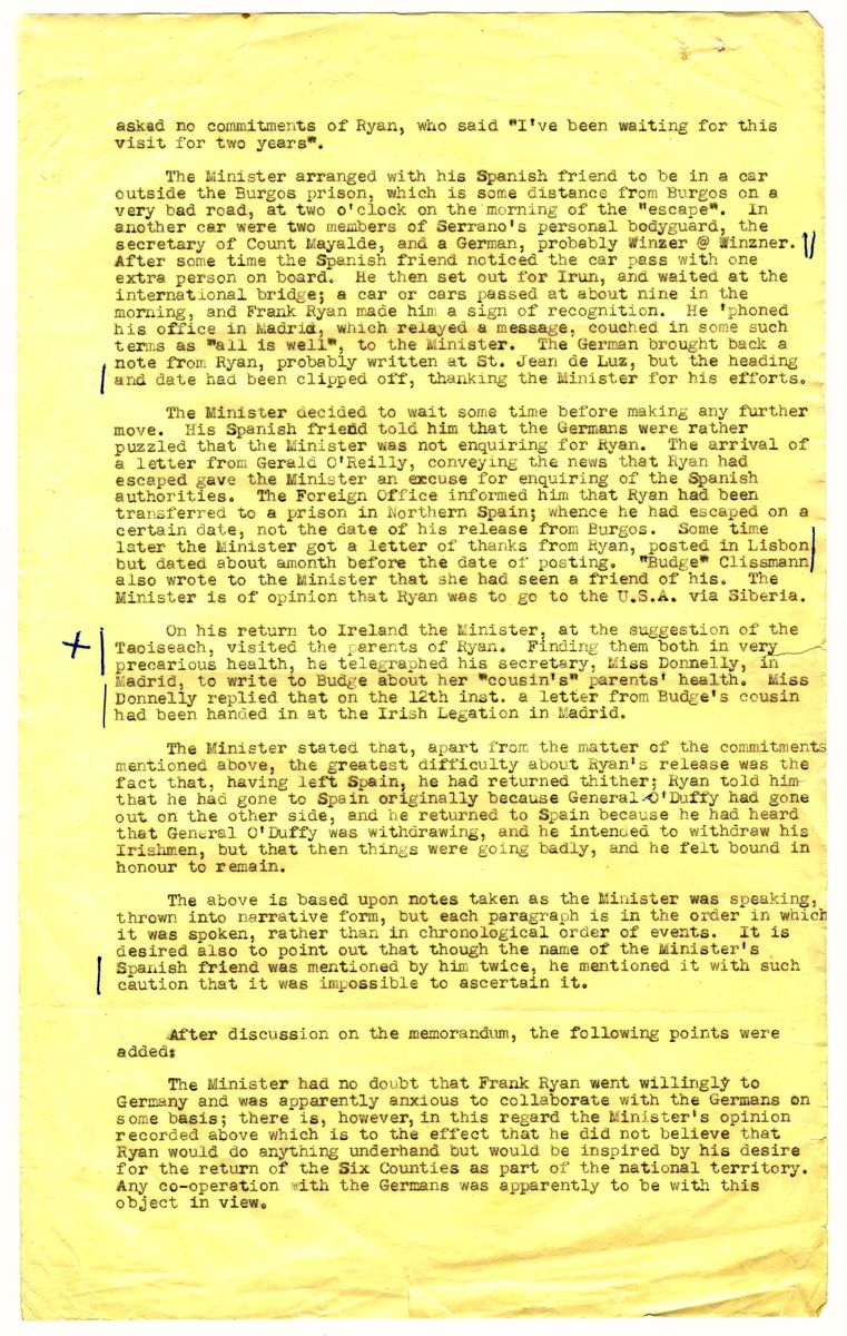 It is not clear whether Kerney’s efforts to use German support to secure Ryan’s release had de Valera’s approval. Although it has been suggested that de Valera authorised Ryan’s handover to German intelligence agents, this seems unlikely given the extent of the Irish government’s concern that IRA collaboration with Nazi Germany would undermine Irish neutrality. Document 2, a report of an interview with Leopold Kerney by Irish military intelligence, clearly demonstrates official concern about the role played by the Irish diplomat in securing Ryan’s release.