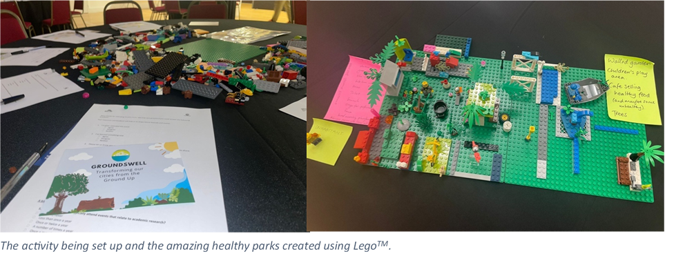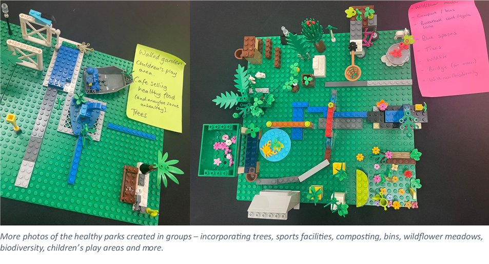 This was followed by an interactive workshop, led by Dr Emilia Trepasso (C-GULL), using LegoTM to create different aspects of a healthy park, and discuss this in groups to create a larger park incorporating each individual aspect. This was a great activity to start thinking about what makes a healthy park, and how the definition of a healthy park can differ from person to person.