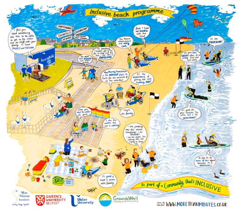 The term Inclusive Beach was coined by Mae Murray Foundation (MMF) to describe a beach environment which has been carefully planned to ensure so that people of all ages and abilities (those with a physical, sensory or learning disability, including those with complex medical needs) can take part. Inclusive Beaches provide access, parking, and toilets, to full Changing Places standard whenever possible. Inclusive Beaches in Northern Ireland offer free beach equipment loan schemes, operated as a partnership between Mae Murray Foundation and respective beach operators.