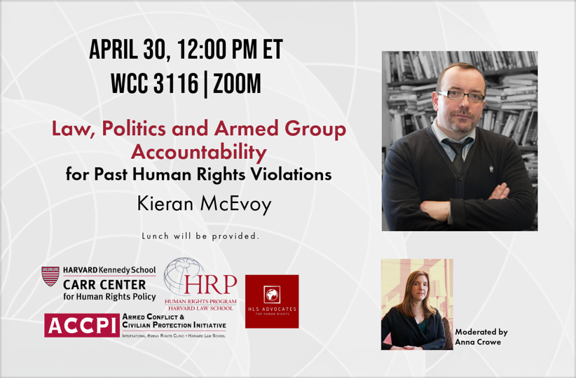 One of the highlights was delivering a talk on 30 April at the Harvard Law School on Law, Politics and Armed Group Accountability for Past Human Rights Violations. This session, moderated by Anna Crowe, a Senior Clinical Instructor and the Associate Director of Harvard Law School’s International Human Rights Clinic, explored the intersection between law, politics and agency in seeking to encourage armed groups to take responsibility for past human rights violations. Drawing on almost three decades of experience in working with armed groups in Northern Ireland, as well as comparative fieldwork conducted in over a dozen conflicted, authoritarian or transitional societies, the talk examined how to get armed groups to engage with transitional justice processes such as truth recovery, reparations, apologies and acknowledgement for past harms. The limitations of legalistic engagement with armed groups and the controversial topic of amnesties or limited forms of immunity to encourage such processes were examined. Kieran also proposed a schema by which the legitimacy of reparative actions by armed groups such as truth recovery or apologies can be assessed.