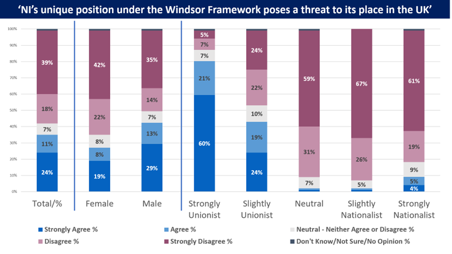 - 81% of those identifying as ‘strongly unionist’ believe Northern Ireland’s place in the United Kingdom is threatened by the Windsor Framework arrangements (60% strongly so). Those who identify as ‘slightly unionist’ have more varying views on the subject: 43% agree and 46% disagree.