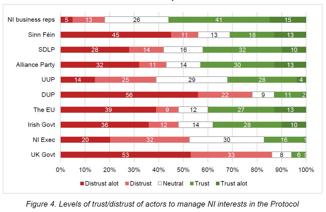 The adoption of the Protocol and its implementation involves a range of actors. As with the last poll, the only group that is trusted by a majority (56%) to manage the interests of Northern Ireland with respect to the Protocol are NI business representatives.
