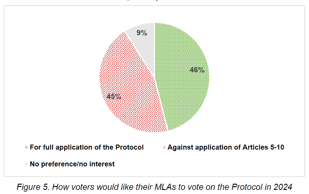- Respondents are almost evenly split on whether their MLAs should vote in favour of (46%) or against (45%) the continued application of the Protocol in the 2024 ‘democratic consent’.