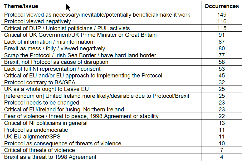 The comments section section reveals significant criticism of the UK government, much of it from unionist/pro-Leave respondents with several focusing on its enacting of a ‘hard’ Brexit and its apparent disregard for the interests of Northern Ireland. Some put the blame for the effects and problems with the Protocol on the Prime Minister, Boris Johnson.