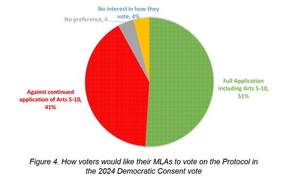 - Respondents are no longer evenly split on how their MLAs should vote in the 2024 ‘democratic consent’ vote; a narrow majority of respondents (51%) favour MLAs voting for the continued application of the Protocol