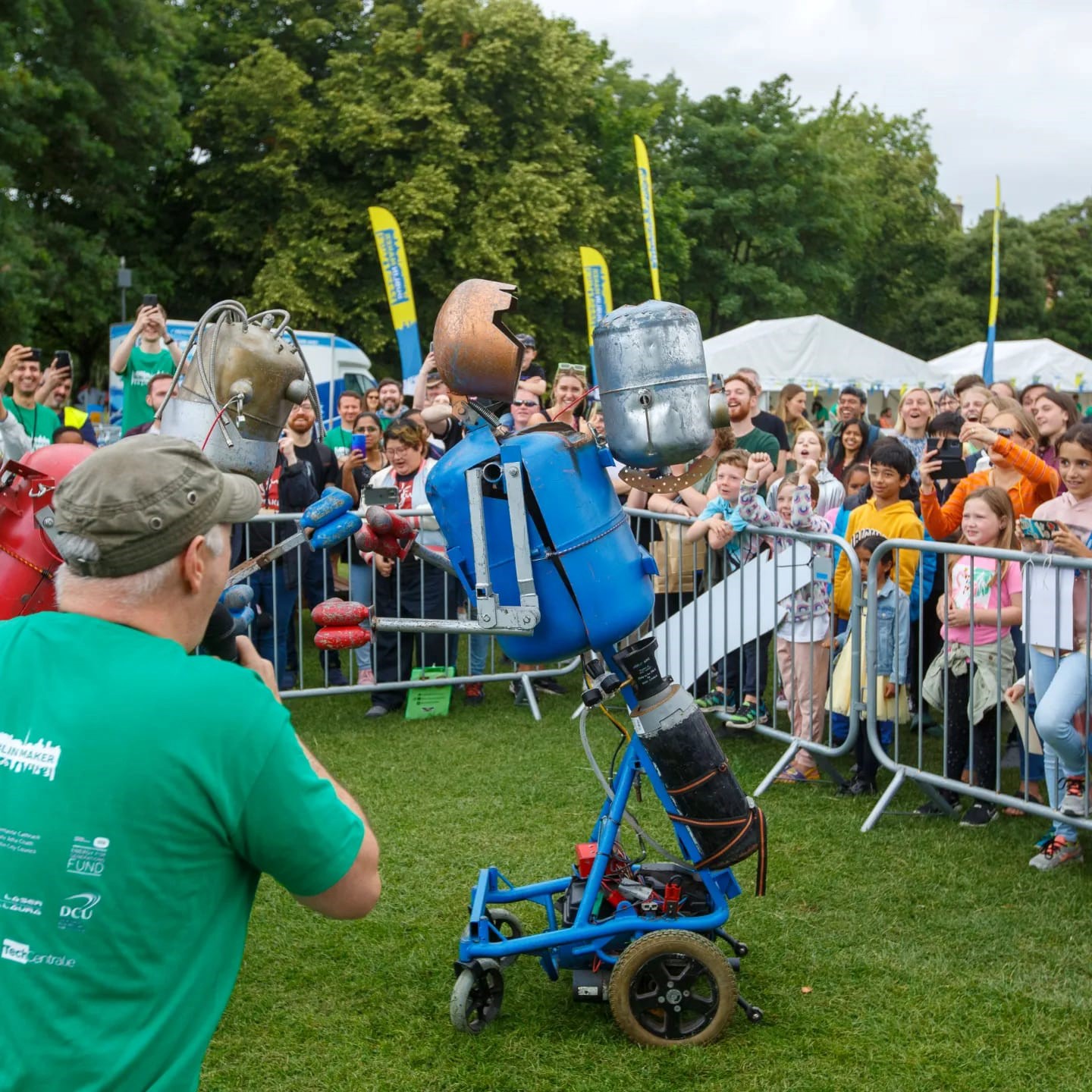 We got speaking to every stall holder on the site and throughout the day built up a really good idea of how far the scene has developed, what people have learnt this past decade, and where they see it going in the next 5 to 10 years. Their enthusiasm for science and education was really strong and given the massive numbers of kids attending with families, it’s clear that there is an enormous appetite for STEAM learning among young people. We got speaking with a few families who had involved their children in after school education camps and everyone gave extremely positive feedback on its value, how much their kids enjoyed it, but also how few places and opportunities existed to facilitate these programs. A good few of the stalls’ main focus was STEAM education, whether running programs or making education tools, and gave us some very useful pointers on how to best deliver STEAM education. After a visit to the food stalls, the day finished with a clash between two craft lab-built robots. Fitted with mitts and helmets the metal giants entertained a huge crowd in the day’s finale.