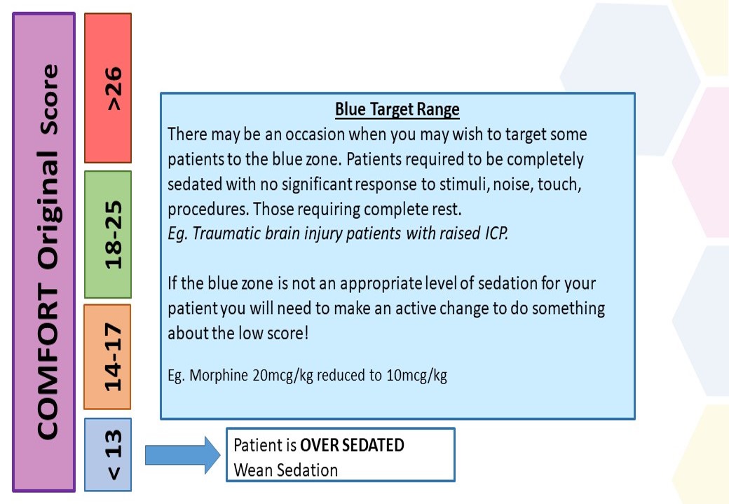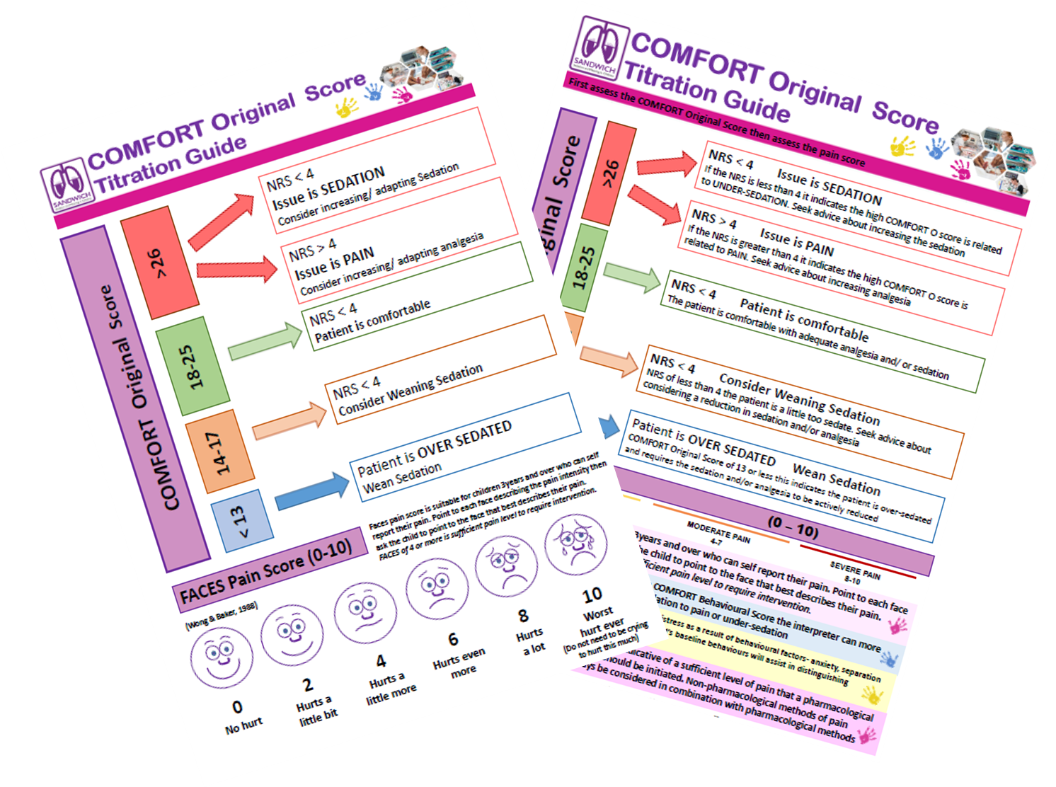 The titration guides are designed to aid clinicians to identify how appropriately sedated a patient is, and if any changes are required to optimise their sedation and/or pain management. We ask the clinician to refer to the guide to identify if the patient is optimally sedated, over sedated or under sedated. If the patient's COMFORT Score is too high the titration guide advocates the clinician assess a pain score to identify if the high score relates to a pain or sedation issue.