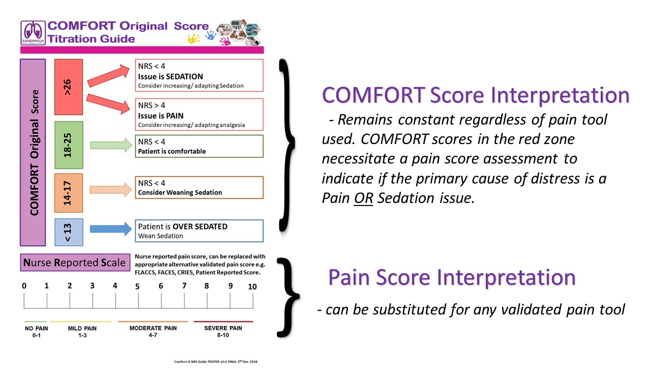In each version of the titration guide the COMFORT Score colour coded zones remain constant. The changable section is the pain assessment tool used to indicate if a high COMFORT Score relates to a pain or sedation issue.