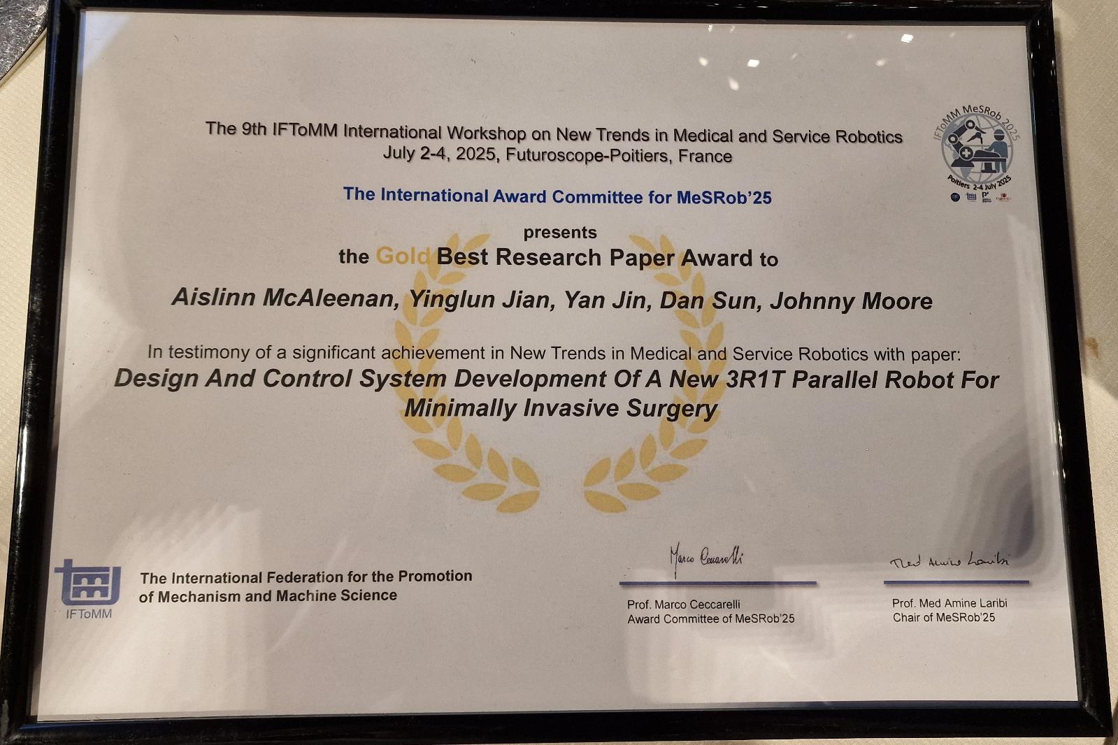 - Our student Ms Aislinn McAleenan won the Best Poster Award at the 8th IEEE UK & Ireland RAS Conference (RAS2025) on 20-21 Feb. 2025 at Belfast, UK. The poster title is "CASPER: A New Parallel Robot for Minimally Invasive Eye Surgery".